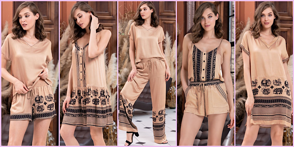 Жаркая пустыня, зыбучие пески, постоянно дующие пассаты, дикие животные, а может таинственные символы африканских племен или невероятные закаты- все это послужило вдохновением для создания коллекции Rianna Mia-Amore. Коллекция выполнена из шелковистой вискозы песочного цвета с купонным, этническим принтом черного цвета, в виде стилизованных иллюстраций африканской фауны. Изделия коллекции имеют простые формы и свободные силуэты, но это не помешает создать свежий и колоритный образ.