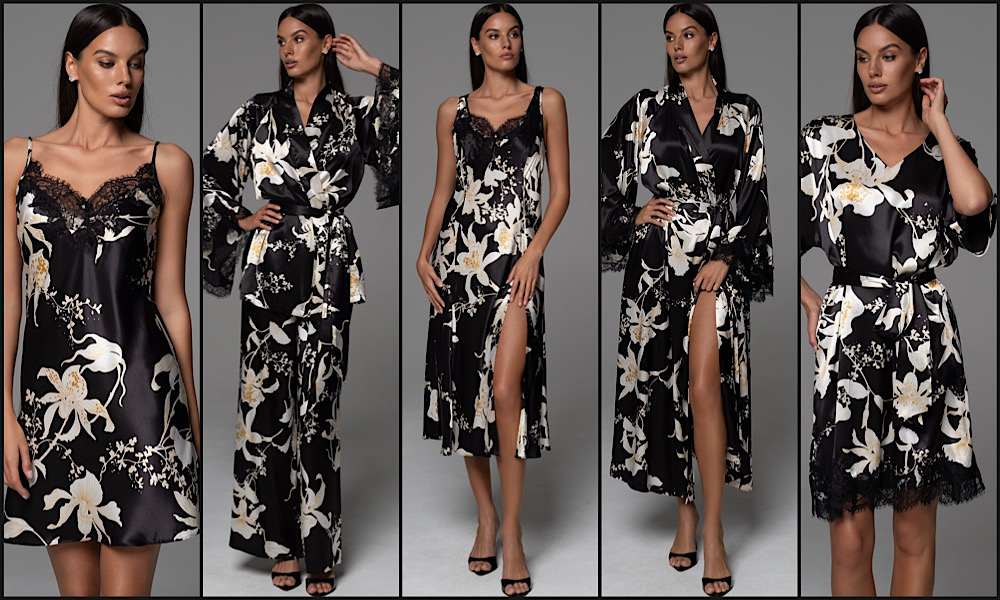 Особенно выразительно смотрится шёлковая линия коллекции: глубокий чёрный фон усиливает контраст, позволяя белому рисунку орхидей и кружеву раскрыться во всей красе. Эта игра контрастов придаёт образам особую глубину и элегантность.